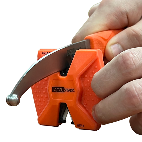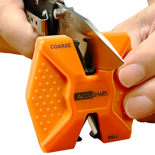 The AccuSharp® 2-Step Carbide-Ceramic Knife Sharpener features pre-angled diamond-honed tungsten carbide blades and fine ceramic rods that will maintain an accurate edge. Just three or four strokes through the coarse slot restores the edge then three or four strokes through the fine rods finishes and polishes the fine edge for a smooth sharp finish. Available in blaze orange.
