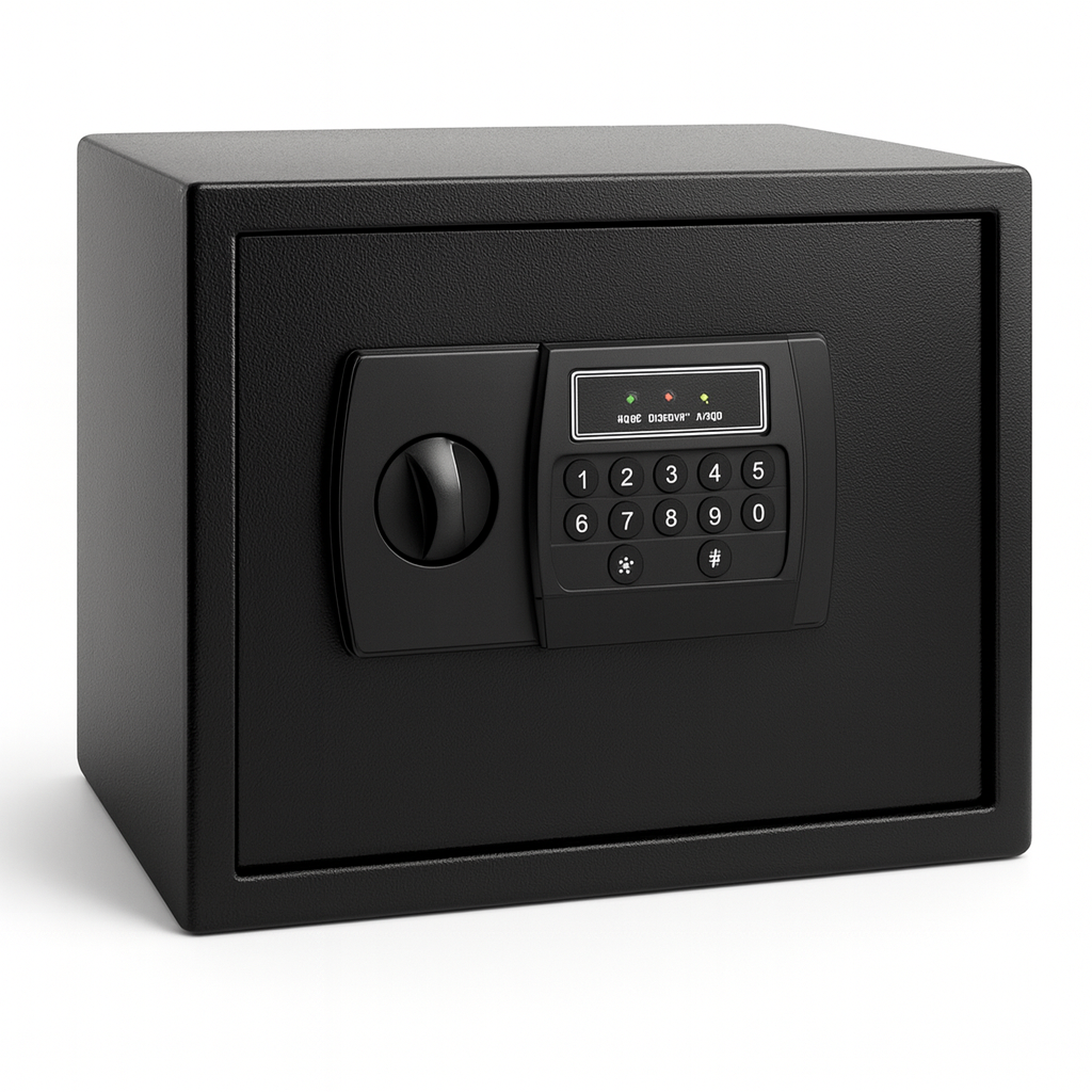 Compact, secure storage for a single handgun with the convenience of a user-set combination lock. Built from 6 mm steel with concealed hinges and two locking bolts, the SAFENO8 gives reliable, keyless protection for a pistol, documents or small valuables while remaining small enough to stow in a cupboard, vehicle or bedside drawer. An internal shelf keeps items organised and the safe’s 32 kg weight helps deter casual removal.