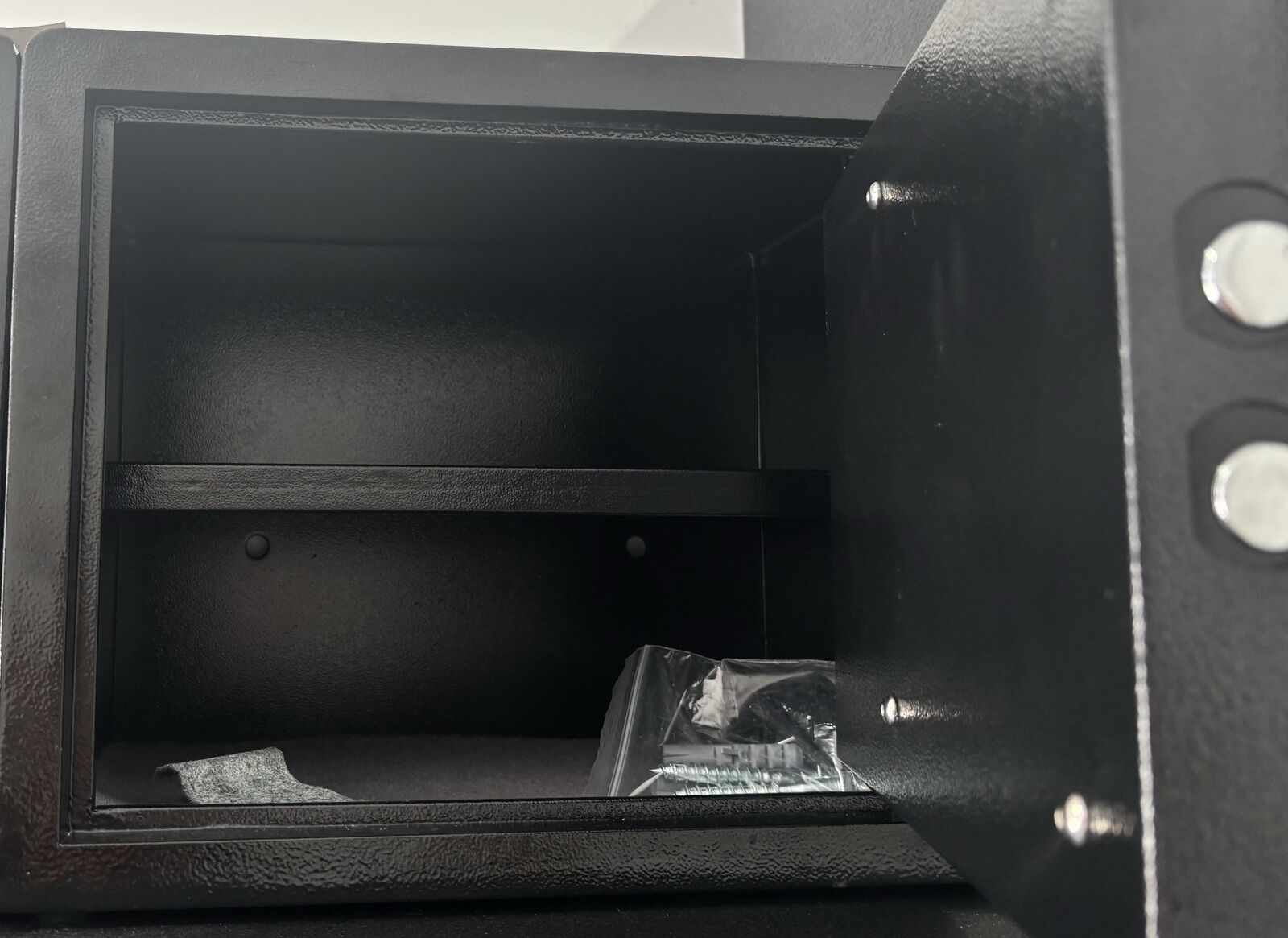 Inside you get a neat storage layout with a fixed/internal shelf for organised storage. At 32 kg the safe is substantial enough to resist casual removal, and the simple keyed lock keeps access quick and familiar.