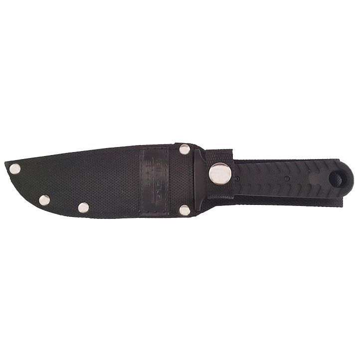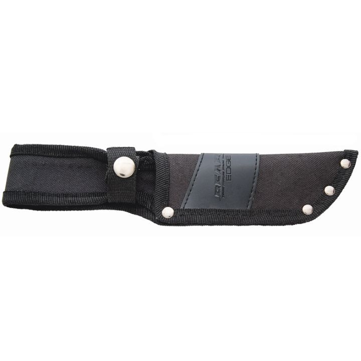 Pattern 108 is a USA built 9-1/4” Black Compact Bowie knife that is part of the Bear Edge® line and weighs 5.8 ounces. The 5” hollow ground blade is made with 440 High Carbon Stainless Steel with a black powder coating to help prevent rust and is easy to sharpen. This fixed compact bowie is designed with a stainless-steel guard and the Bear Edge® logo is engraved on the blade. The handle is made with a rugged Black G10 style for a secure grip and comes with a ballistic sheath for belt carry. A lanyard hole is also present on the back of the handle for secure fastening and storage.