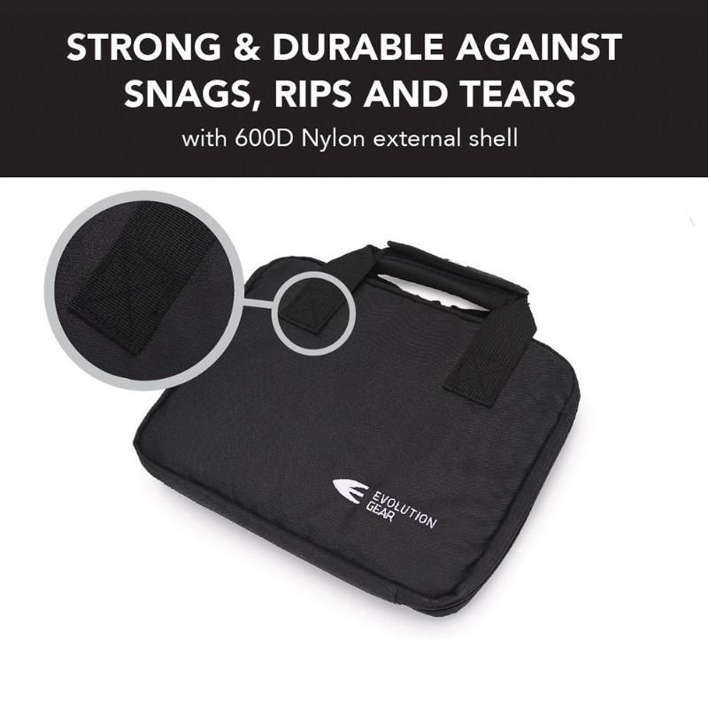 The Evolution Gear Pistol Bag offers safe protective transportation of your hand gun and magazines. This Soft case was designed for the purpose of increased protection, safety and functionality.