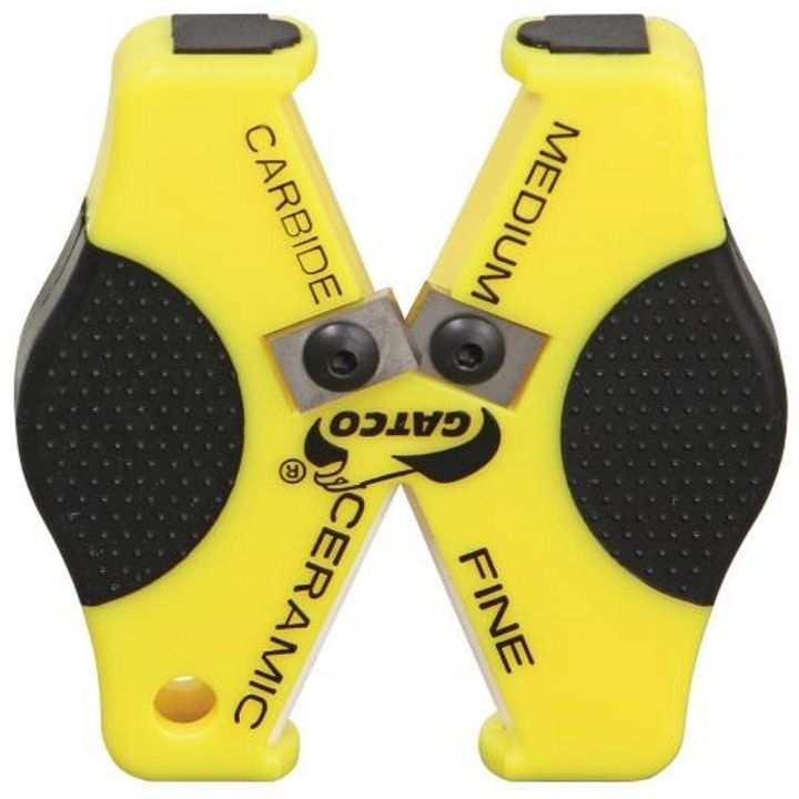 This unique sharpener combines the best features of our GATSTIX® ceramic sharpener and Edgemate® carbide sharpener. Two precision ground, tungsten carbide blades pre-set at 35°, quickly sharpen the dullest blades in four or five light strokes. The two fine ceramic rods at a pre-set angle, put the polished, final edge on your blade.