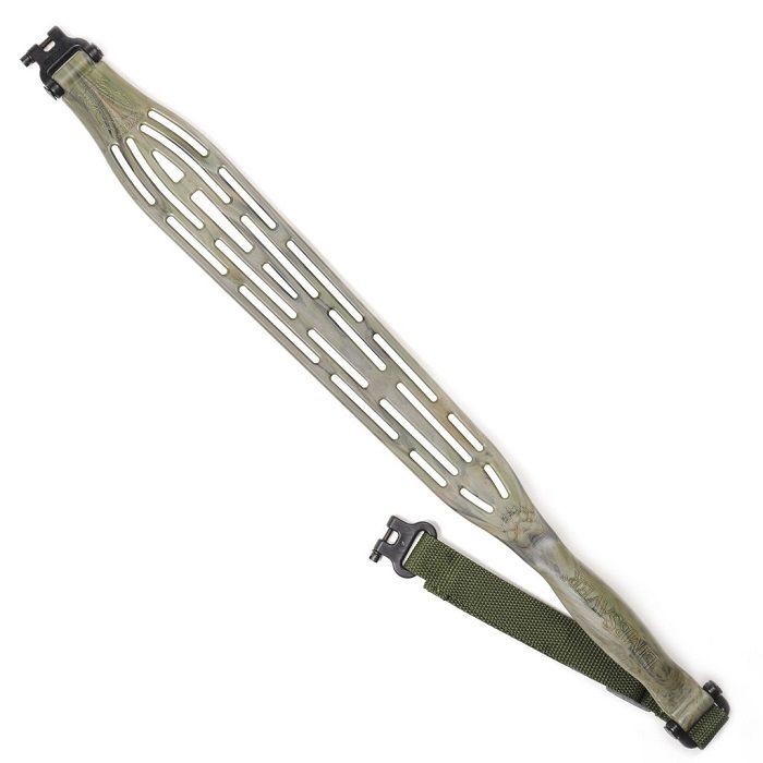 The Limbsaver Kodiak-Lite Rifle Sling in camo combines light weight with serious all-day comfort. Its contoured NAVCOM pad grips your shoulder and spreads the rifle's weight over a wider area to combat fatigue. A textured, ergonomic handgrip and rugged swivels make it easy to control the rifle one-handed while negotiating rough terrain.