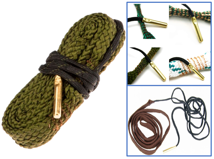 The Patrol Pistol Barrel Pull Through Rope Cleaner is a long woven cotton cleaning rope with a weighted brass head attached to the front of the pull cord. The beginning of the bore snake has a large puffed ball of cotton where you can add gun cleaner, gun oil or anything else you want to put on it. Further down the snake, there is a brass bore brush followed by a length of wide woven cotton fabric that is squeezed in the bore tightly removing loosened carbon and copper or lead fouling. The long woven snake provides a huge amount of contact area that scrubs, wipes and cleans the barrel bore like nothing else you have seen before. The Patrol Pistol Barrel Pull Through Rope Cleaner is much more effective than a single patch or multiple patches pulled thru the barrel once or multiple times. It has a much tighter fit than any patch with much more contact area.