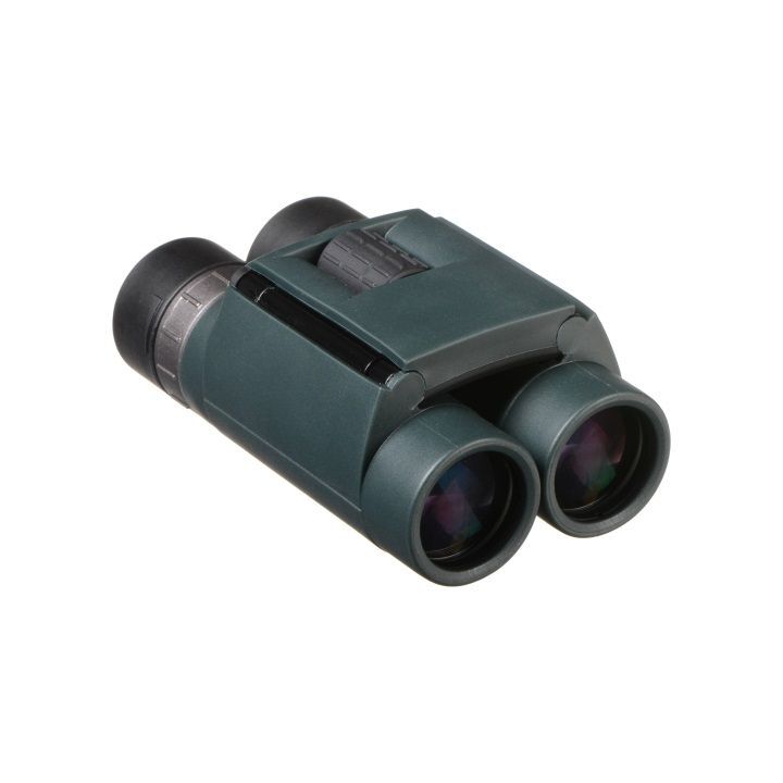 An asymmetrical hinge design enables the binocular to be folded up much smaller than typical center-hinged optics. In order to cut weight, the housing is made of corrosion- and impact-resistant fiberglass-reinforced polycarbonate polymer. The material is also temperature resistant, allowing for its use in extreme climates while reducing expansion and contraction that wide temperature swings can cause (and which can make the optical components move out of collimation over time). Its optical tubes are nitrogen filled and O-ring sealed, making them submersible to 3.3' as well as fogproof in all weather conditions.
