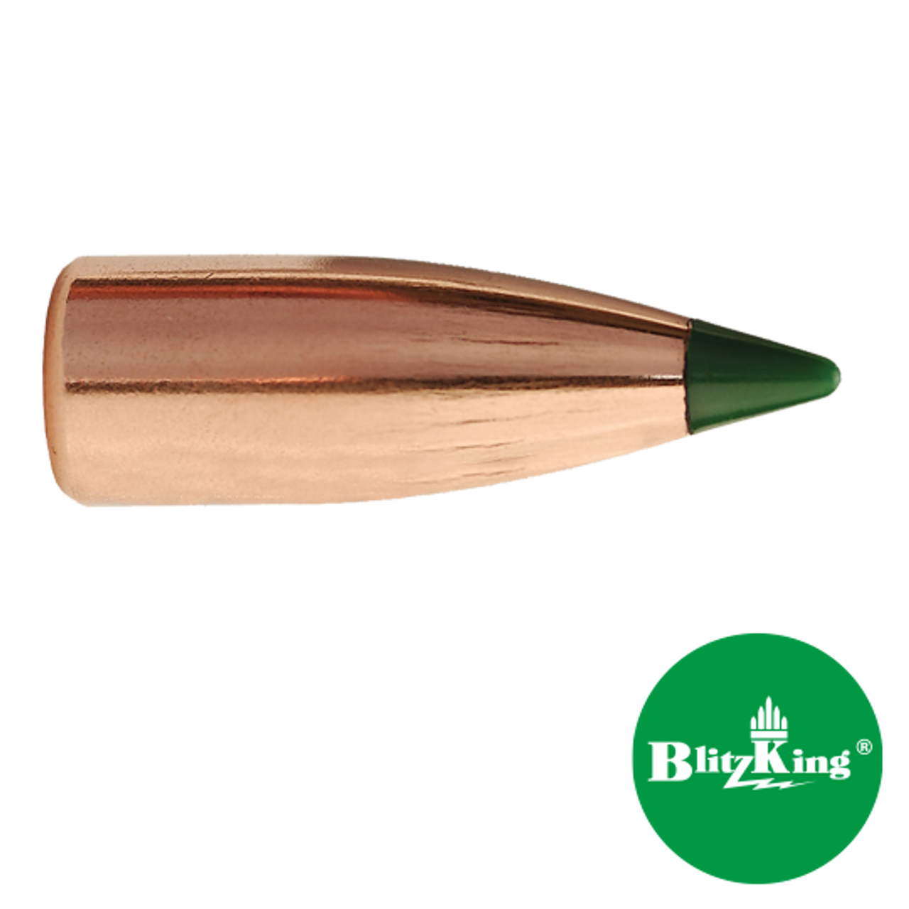 For rifles, these bullets are designed for explosive expansion in varmints and small game and with accuracy characteristic of the MatchKing bullets. The nose tips of these bullets are made of a proprietary acetyl resin compound, and the sharp tips improve the ballistic coefficient over the traditional flatbase spitzer bullet design. The 55 grain #1502 has a flatbase. The jackets are thin for enhanced accuracy and explosive expansion, but are capable of withstanding high velocities. These bullets are designed to be fired at muzzle velocities up to 4000 fps. For handguns chambered in 6mm TCU, 6mm PPC, 6mm Benchrest Remington, these BlitzKing bullets are superbly accurate and have devastating expansion on varmints and small game at velocities achievable in these handgun cartridges in single-shot pistols.