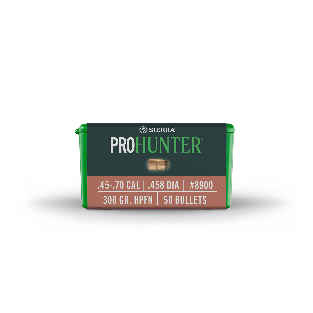 Sierra offers a flatnose bullet in this 45 caliber specifically for the 45-70 bore size. It may be used in rifles or handguns with a .458 inch bore, but it must not be used in handguns with .451 or .454 inch bore size. Sierra introduced this bullet in 1973 – the 100th year of the 45-70 cartridge. Now, decades later, this old cartridge is still growing in popularity and justifiably so. Adequate for any game in North America and offered in several modern firearms, this old cartridge is just plain fun. The bullet is unique in that it expands well at modest 1873 Springfield velocities or at the more powerful full charge velocities that can be loaded in stronger action types, such as the Ruger No. 1 and No. 3 and Marlin lever actions. Accuracy is excellent, and it feeds reliably through all types of magazines and actions. It can be used in the 458 Winchester Magnum cartridge, but muzzle velocities should not exceed 2500 fps. For handguns, this bullet was designed to expand reliably even at 1300 fps. It is a perfect match for the T/C Contenders and similar handguns chambered for the 45-70 cartridge. Dependable expansion and excellent accuracy make this Pro-Hunter bullet a good choice for most hunting situations.