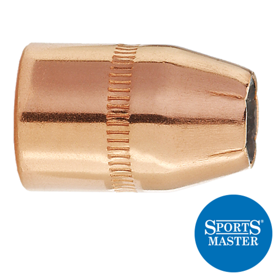 These Jacketed Hollow Point SportsMaster bullets are designed for high velocity and rapid expansion, and are suitable for all 38/357 cartridges used in handguns or rifles. Power Jacket skiving assures even upset, and Sierra's unique cavity ensures quick expansion. Tough enough to give good penetration, these bullets are a fitting choice for varmints through medium-sized game in 38 Special and 357 Magnum guns by matching bullet weight to the quarry. The cannelure is located for proper crimping for most 38/357 revolvers and rifles.