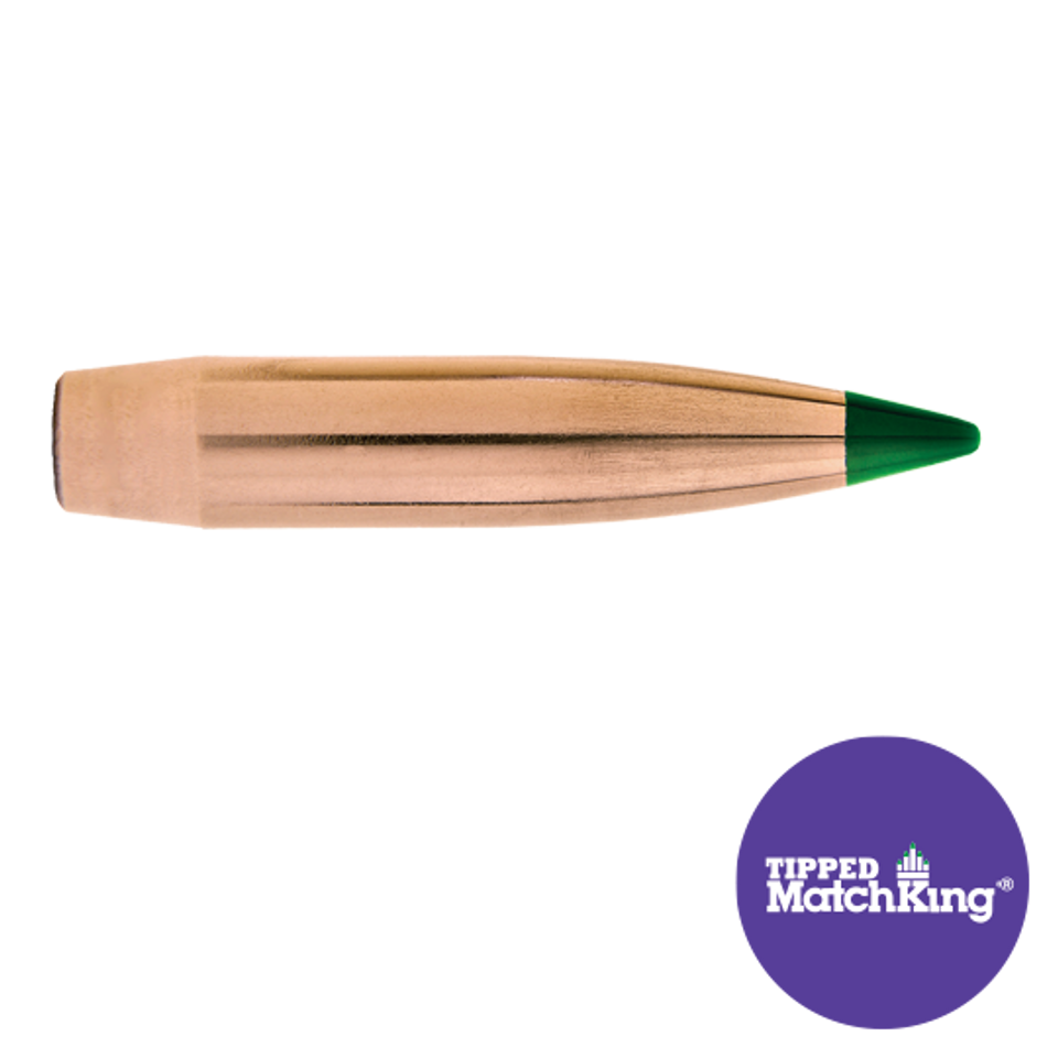 Sierra has enhanced a segment of the MatchKing line by adding the acetal resin tip, thus crowning the Tipped MatchKing (TMK) bullet line. The major advantage of adding a tip to the bullet is the reduction of drag, producing a more favorable ballistic coefficient. Another benefit is reliable feeding in magazine fed firearms. While they are recognized around the world for record-setting accuracy, MatchKing® and Tipped MatchKing® bullets are not recommended for most hunting applications. Although MatchKing® and Tipped MatchKing® bullets are commonly used for varmint hunting, their design will not provide the same reliable explosive expansion at equivalent velocities in varmints compared to their lightly jacketed Hornet, Blitz or Varminter counterparts. The #7430 was introduced in November 2015. This bullet requires a barrel twist rate of 1×8" or faster.