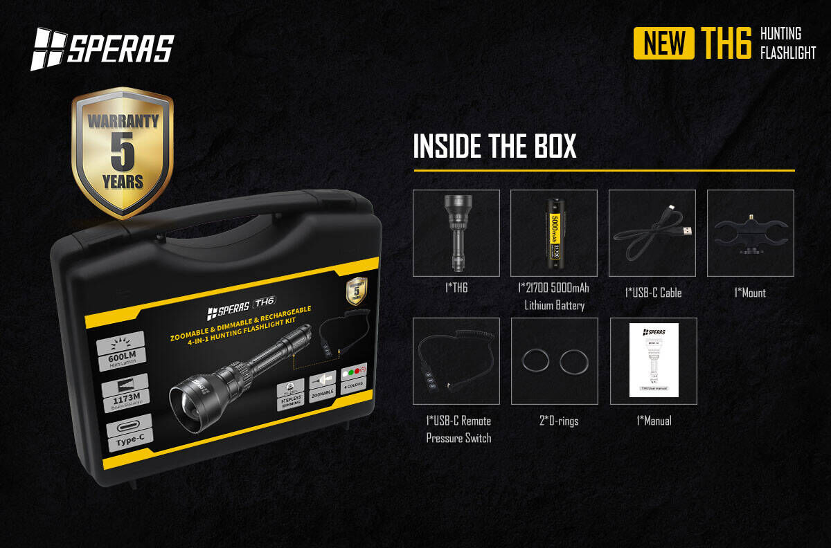 The Speras TH6K is a robust, zoomable hunting flashlight engineered for outdoor and tactical use. Equipped with four interchangeable LED modules—white, red, green, and 850 nm infrared—this kit delivers versatile, multi-mode lighting tailored for a range of night-time activities.